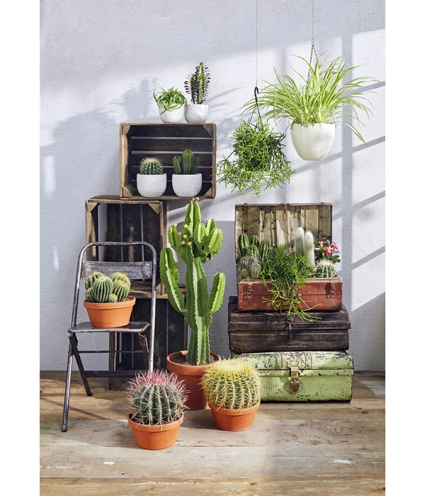 Kakteen und Sukkulenten liegen nicht ohne Grund voll im Trend. Sie sind pflegeleicht und präsentieren sich in den unterschiedlichsten Wuchsformen, so dass es auch für ungeübte Dekorateure ein Leichtes ist, beeindruckende Szenerien zu gestalten. Kombinieren Sie zum Ferokatus einen Bogenhanf, verschiedene Echeverien und Aloen sowie eine Abessinische Wolfsmilch, streuen Sie etwas Sand darunter und legen einen urigen Ast dazwischen – und lassen sich für Ihre Deko-Künste bewundern!
