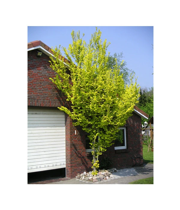 Wenn sie sich im Schmuck ihrer leuchtend goldgelben Blätter zeigt, macht sie ihrem Namen alle Ehre. Doch nicht nur das Blätterkleid ist eine Sensation, die Gold-Ulme ‘Wredei‘ kann auch eine imposante Wuchshöhe von 8-10 m erreichen. Weil sie diese Höhe aber mit einer säulenförmigen Wuchsform verbindet, kann sie sich perfekt auch in kleineren Gärten in Szene setzen. Doch so strahlend die Gold-Ulme vom Frühling bis zum Herbst wirkt, so werden Sie doch bemerken, dass sie die Gelbtöne durchaus zu variieren weiß: Sind die breit-eiförmigen Blätter mit dem gewellten Rand beim Austrieb goldgelb, präsentieren sie sich im Sommer ehe sanft gelb bis gelb-grün, um im Herbst wieder ins Goldgelb überzuwechseln. Die Gold-Ulme ‘Wredei‘ ist eine Kreuzung aus der heimischen Feld-Ulme und der Berg-Ulme und wird sich auch in Ihrer Gartenanlage als robuster Baum erweisen, der dem Gärtner viel Freude, aber wenig Arbeit macht. Entscheiden Sie sich für dieses edle Goldstück und bereichern Sie Ihren Garten mit der Gold-Ulme ‘Wredei‘!