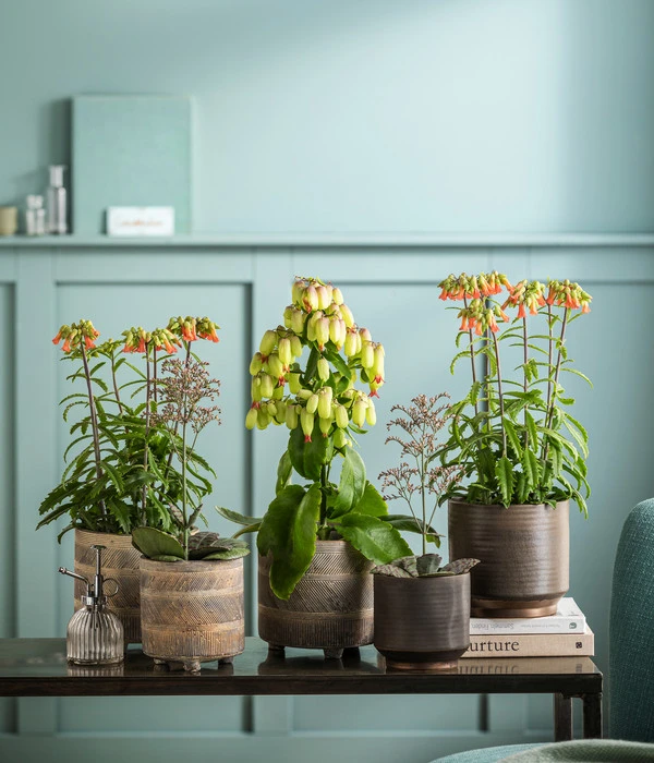 Eine wahre Freude für Blumenfreunde ist die Kalanchoe, denn neben dem Flammendem Käthchen gibt es noch viele weitere interessante Arten, wie z.B. die Sorte ‚Desert Surprise‘. Ein Blickfang ist vor allem das gekerbte, graugrüne Laub, welches violett getigert ist. Auch die kurzstieligen Blütendolden, die kleine grün-purpurrote Blüten zeigen, tragen zum Ziewert der Zimmerpflanze bei. Auch wenn der exotische Anblick der Kalanchoe ‚Desert Surprise‘ vermuten lässt, das hier ein grüner Daumen erforderlich ist, so können sich nun ungeübte Pflanzenfreunde freuen. Die Sukkulente aus der Familie der Dickblattgewächse zeigt sich als äußerst genügsam und gedeiht prächtig bei wenig Pflege.