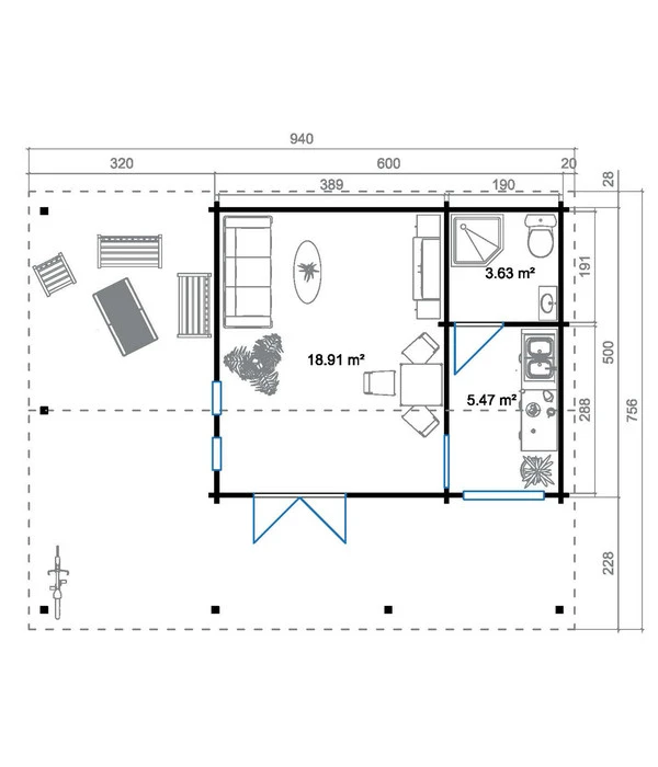 70 mm Wandstärke, Isolierverglasung, Wohnfläche 28 m²