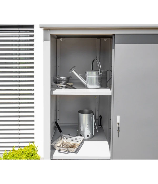 Sind Sie auf der Suche nach einer geeigneten Abstellmöglichkeit für Ihre Gartenutensilien und möchten Sie für Ordnung sorgen? Dann stellt der Gartenschrank Guardian von Trimetals sicher die richtige Wahl dar. Die zwei Regalböden lassen sich verstellen und bestechen mit einer starken Traglast und bieten Ihnen optimalen Stauraum für Ihr Gartenequipment. Dank der robusten Bauweise werden Sie sicher lange Freude daran haben. Schließlich ist der Geräteschrank absolut witterungsbeständig und überzeugt durch die Verwendung qualitativ hochwertiger Materialien.