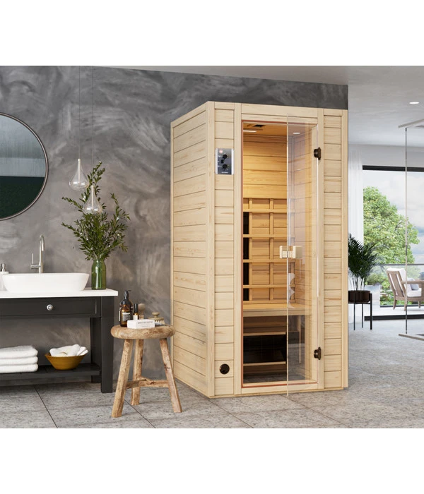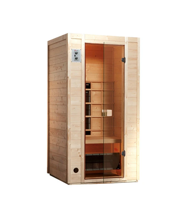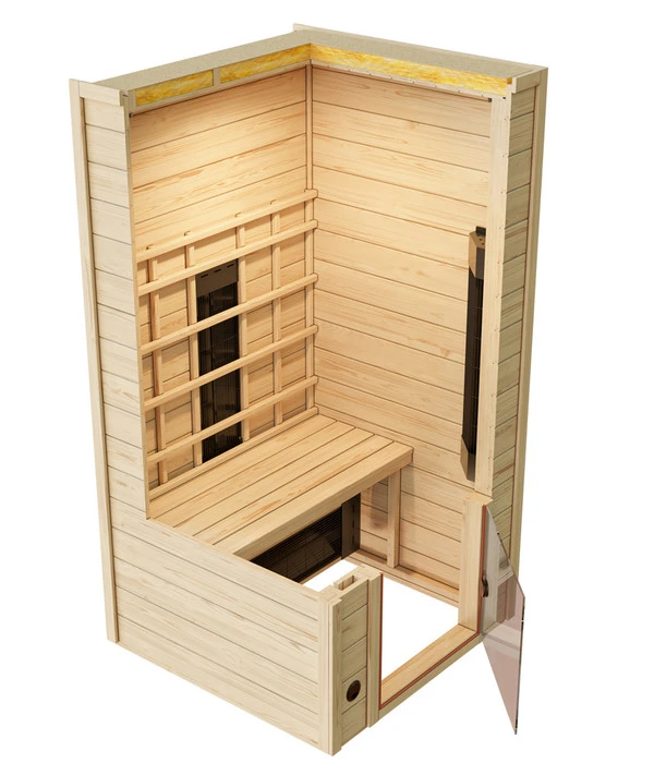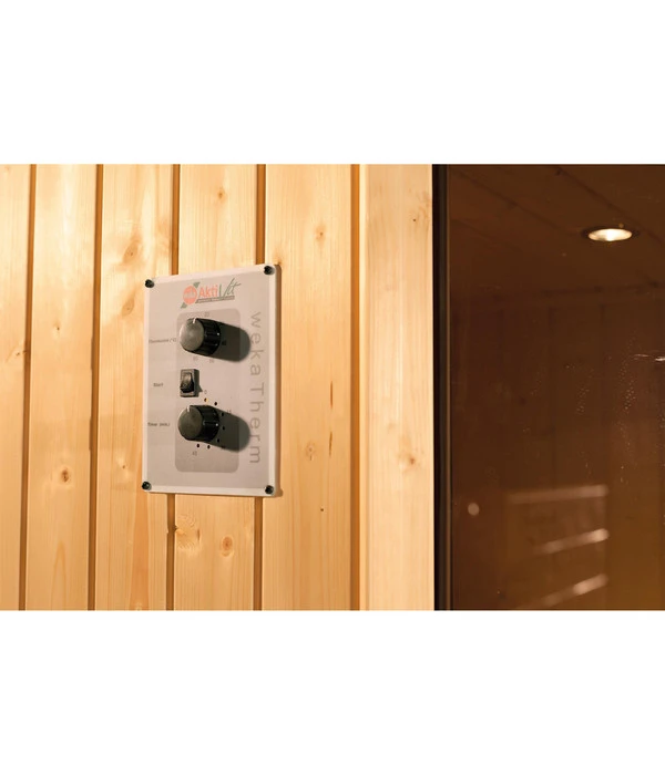 Wände und Decken bestehen bei der Weka Infrarotkabine Vaal aus vorgefertigten Elementen aus hochwertiger, nordischer Fichte. Warum Fichtenholz, das im Norden Europas gewachsen ist? Ganz einfach, weil dort durch das rauere Klima das Holz langsamer wächst und so eine besondere Dichte und Wärmspeicherfähigkeit entwickelt. Außerdem zeigen sich die Hölzer von den Temperaturschwankungen der Weka Infrarotkabine Vaal ziemlich unbeeindruckt. Die Balken sind weitestgehend frei von Astlöchern, verfügen aber über holzeigene Harze und ätherische Öle, die den typischen Holzgeruch verströmen.