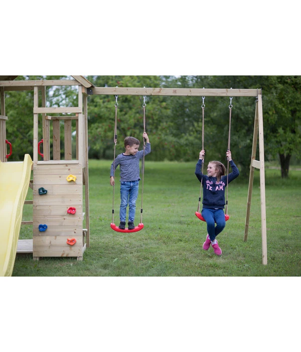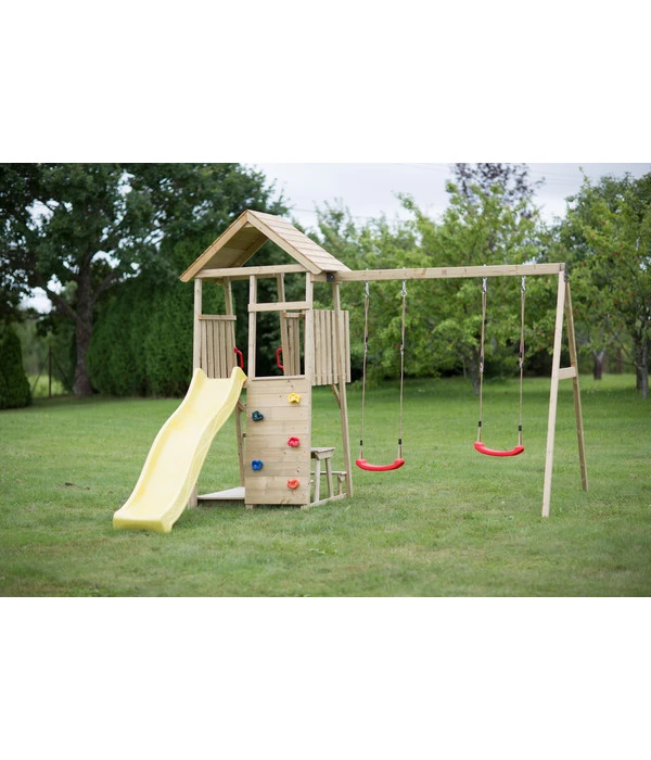 Sie wollen für Ihre Kinder im Garten ein eigenes Spielparadies errichten? Dann ist der Spielturm Giraffe von Wendi Toys genau das Richtige für Sie! Der Turm eignet sich für Kinder ab vier Jahren und bietet viele spannende Möglichkeiten, um richtig schön herumzutoben. Die Rutsche sowie die Kletterwand sorgen für ordentlich Spaß und Abwechslung. Auf der kleinen Veranda mit zwei Sitzbänken und Tisch können sich die Kleinen zurückziehen und eine Pause vom Spielen einlegen, um danach Ihre Zeit auf den zwei Schaukeln zu genießen. Damit es für Ihre Lieben rundum sicher ist, wurde das Spielgerät mit abgerundeten Ecken und Kanten ausgestattet. So können Sie Ihre Kinder sorgenfrei nach draußen zum Spielen schicken und Ihnen viel Kletter- und Rutschspaß gönnen.